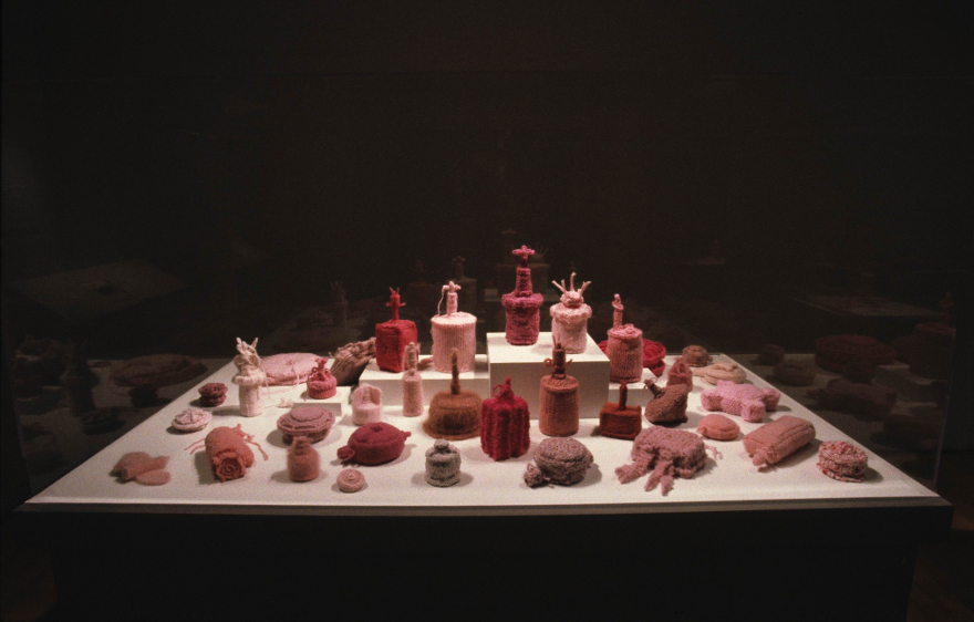 During a Canada Council residency in Paris, I visited the Pyramid of Shoes, an annual protest against land mines, which inspired me to knit replicas of antipersonnel land mines. Knitting is closely associated with caring for the body – it was originally used to make undergarments (the origin of the sweater). Bandages for soldiers were once hand-knitted, and women still knit for soldiers, prisoners, and the homeless. Knitting represents recuperation, protection, and healing. In this work I use these associations to contradict the abuse of power through violence, transforming a destructive object into one that can do no harm.