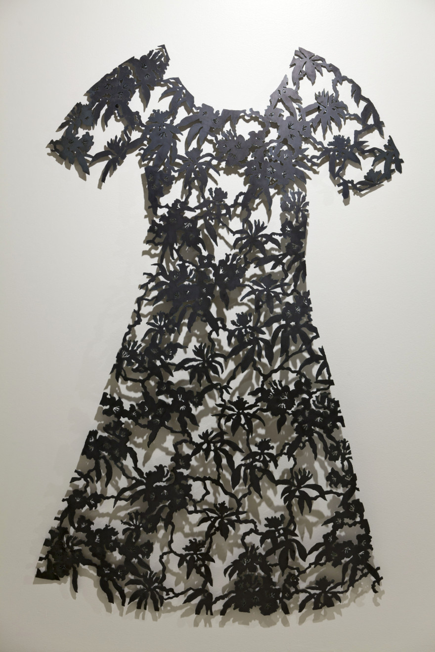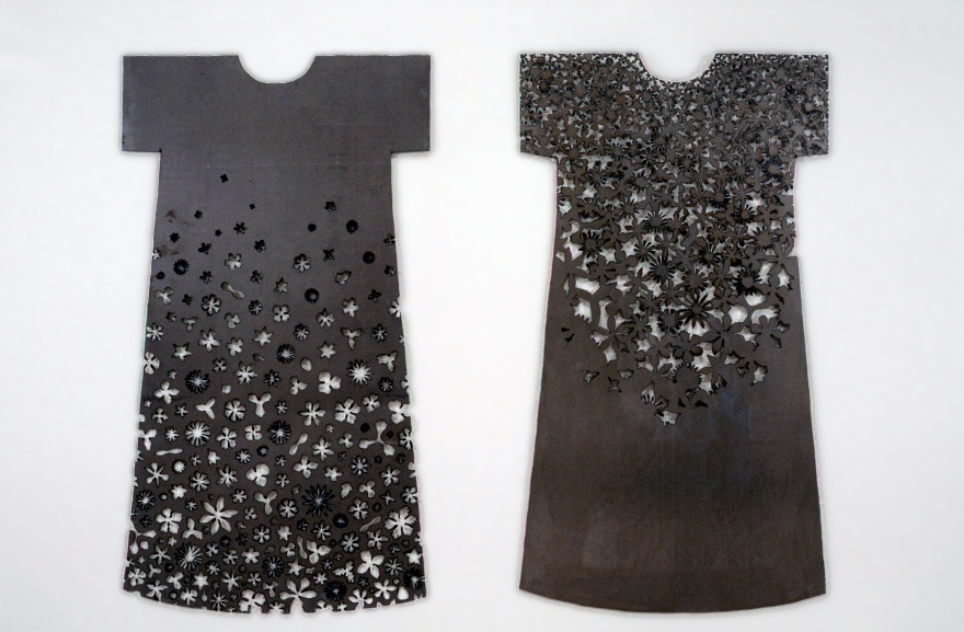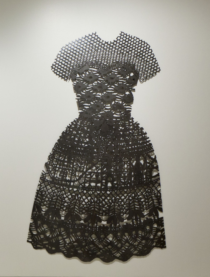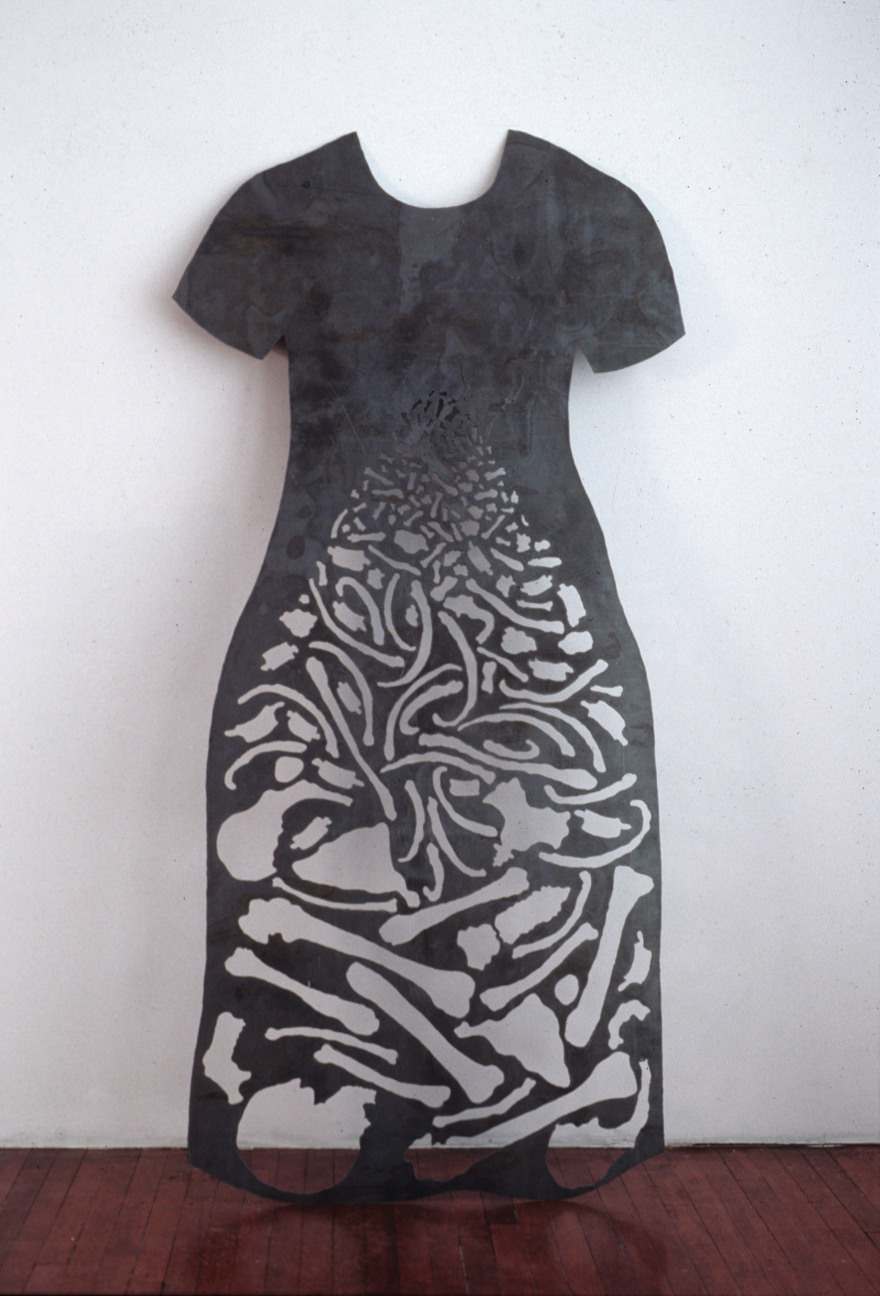 When I was young I made my own clothes, and later worked in a clothing factory to save money for art school. My work as a textile pattern designer in Montreal influenced the imagery in these steel dresses, which I created to express the strength and diversity of women. Using a plasma-arc cutter, I created patterns based on forms historically associated with women. In this work I interweave correlations between material, image, and content to present alternative visions of gender. Feminism supports domestic activities as a valid approach to contemporary art practice, so I consider making these steel dresses as “sewing with fire.”