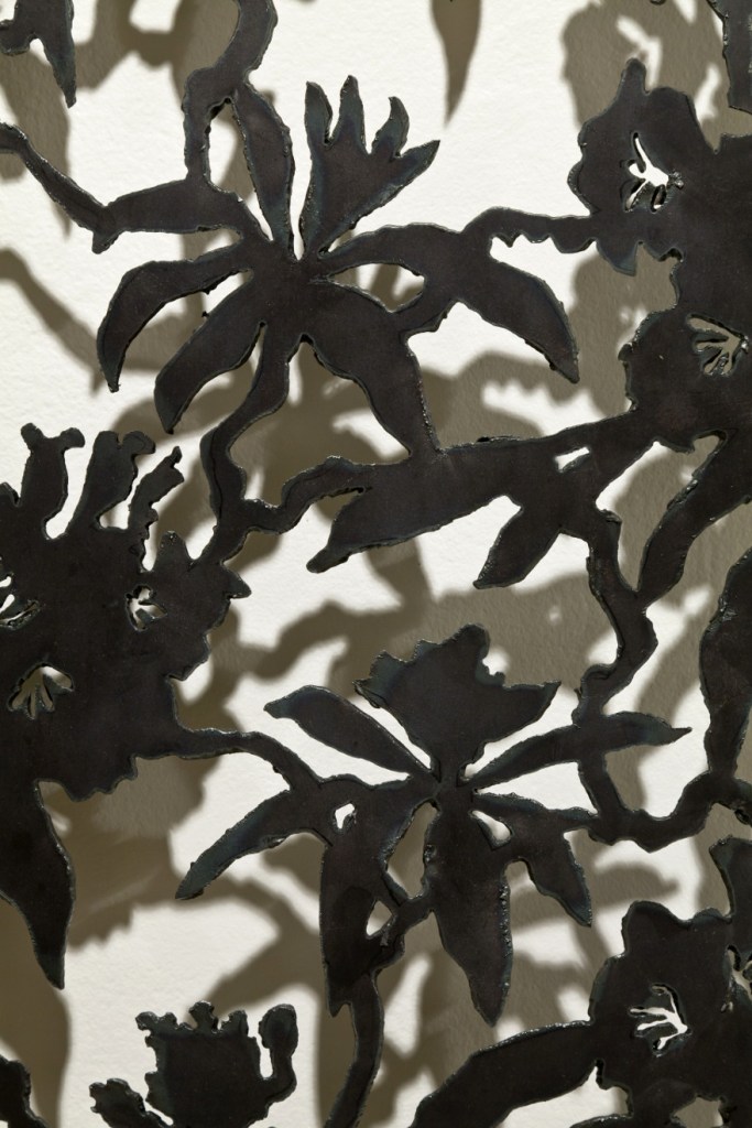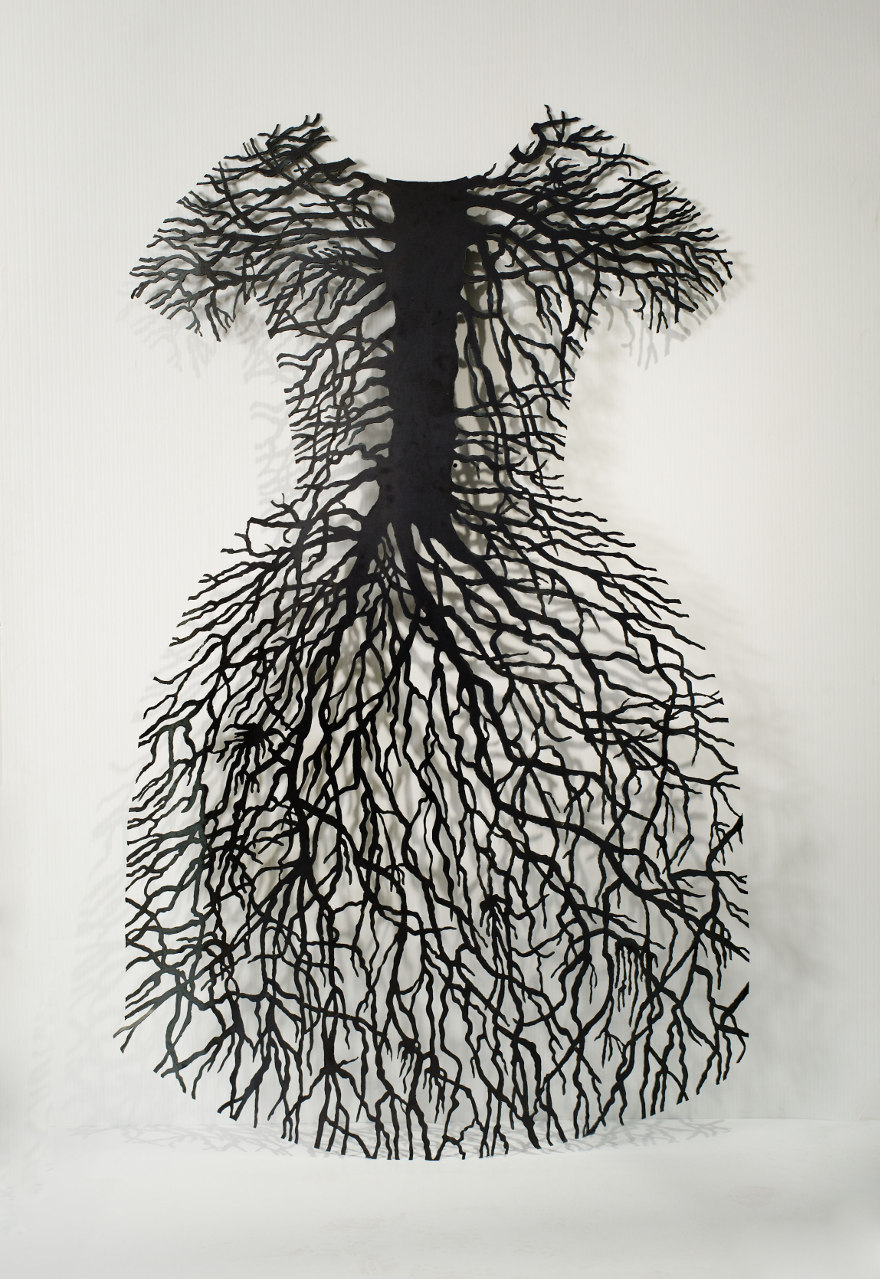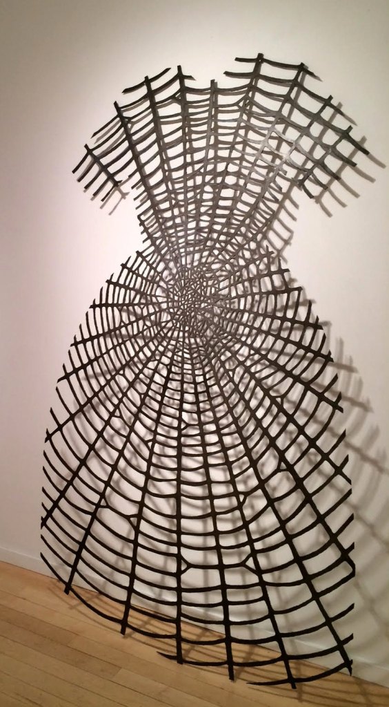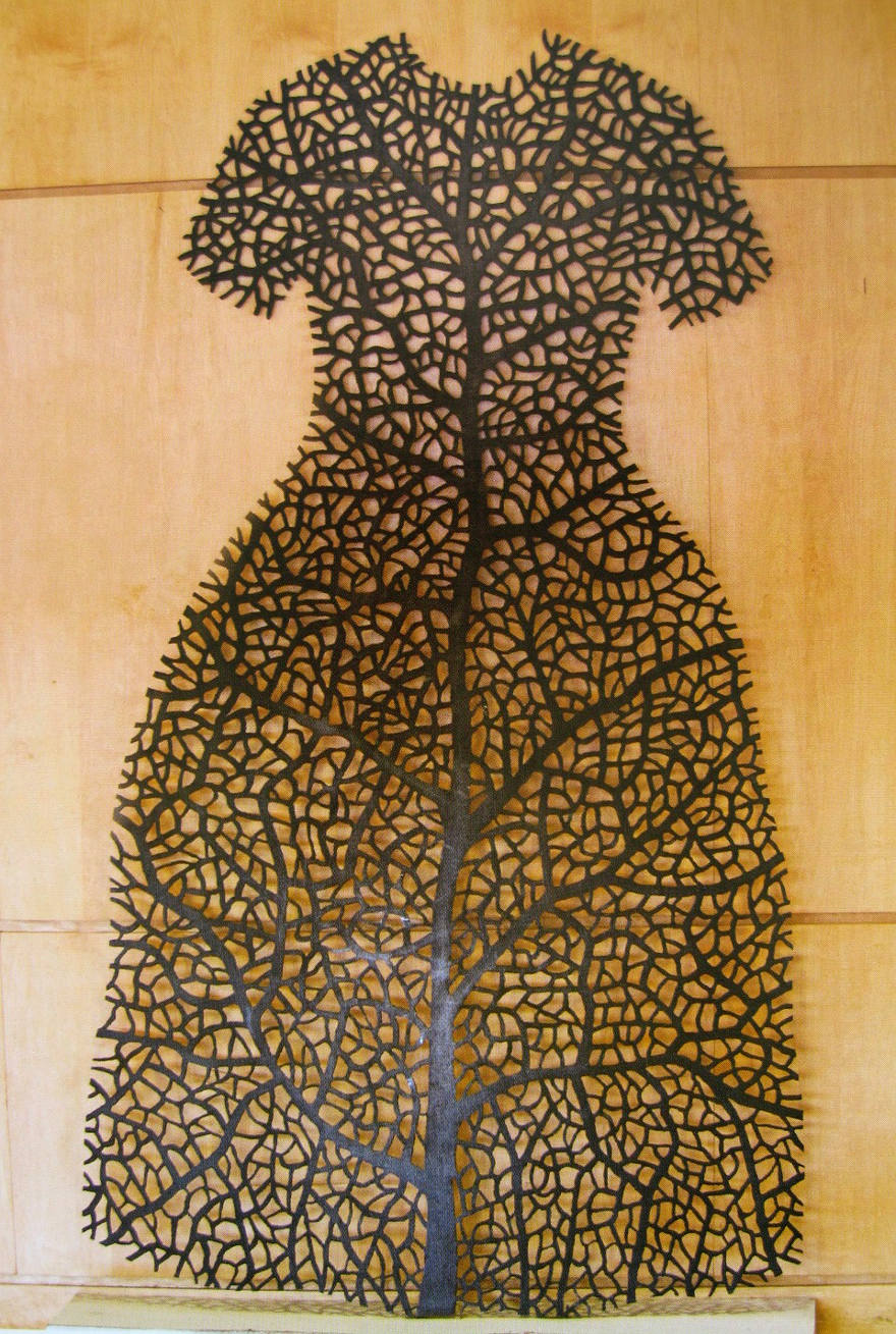 When I was young I made my own clothes, and later worked in a clothing factory to save money for art school. My work as a textile pattern designer in Montreal influenced the imagery in these steel dresses, which I created to express the strength and diversity of women. Using a plasma-arc cutter, I created patterns based on forms historically associated with women. In this work I interweave correlations between material, image, and content to present alternative visions of gender. Feminism supports domestic activities as a valid approach to contemporary art practice, so I consider making these steel dresses as “sewing with fire.”